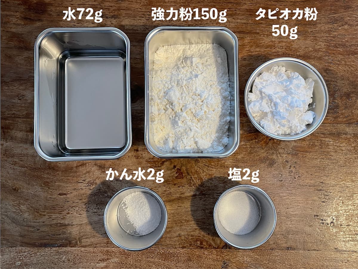 中力粉:200g 準強力粉:135g タピオカ粉:165g 粉末グルテン:10g 粉末かん水:5g 塩:10g 加水率:41%