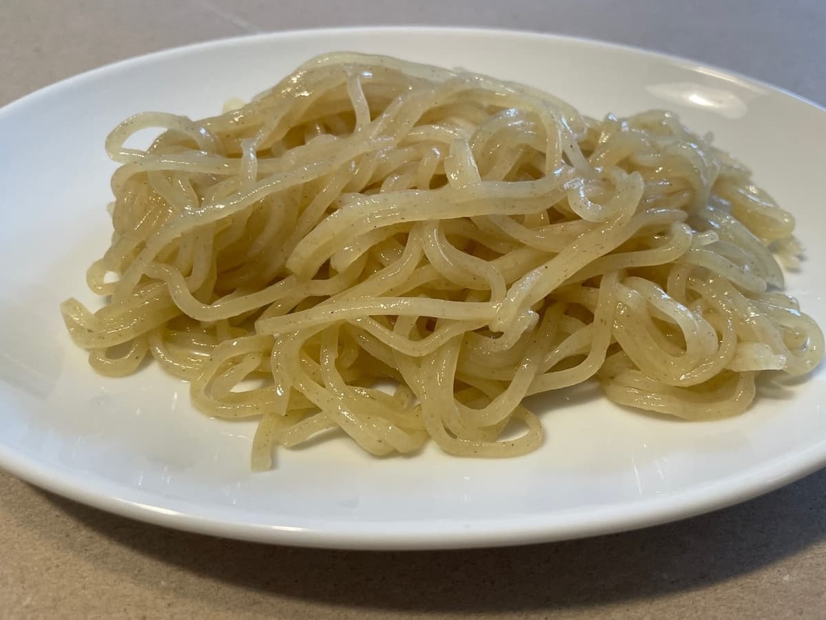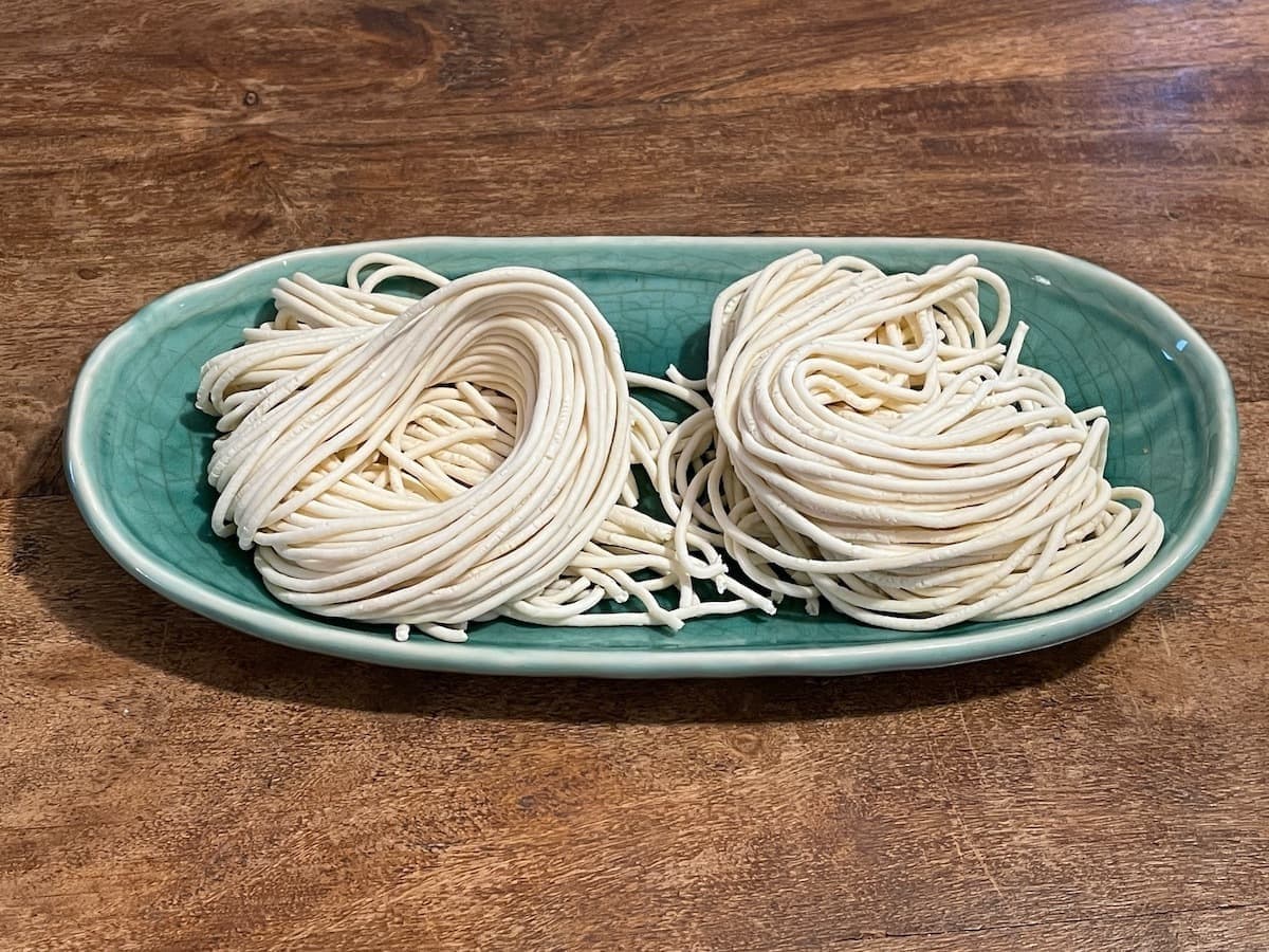 加水率:36%(軟水使用・55〜60℃) かん水:1%(強力粉+タピオカ粉) 塩:1%(強力粉+タピオカ粉)