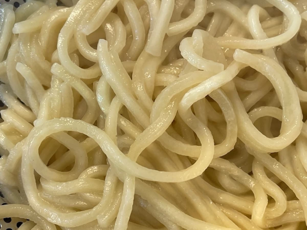 つけ麺用として広く普及しているモチモチ麺ですが、作り方は非常にシンプルで、小麦粉(強力粉)にタピオカ粉を混ぜて製麺するだけです。