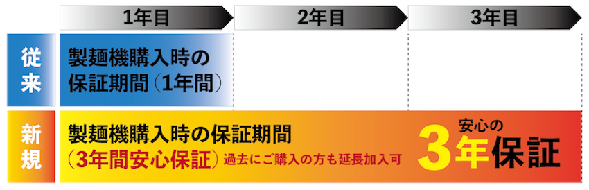 メーカー直販の為、ユーザー様へ高品質な製麺機を適正価格でお届けし、3年間の部品保証をおこなっておりますので、ご安心してご購入いただけます。購入と同時に5年保証を追加延長することが可能です。